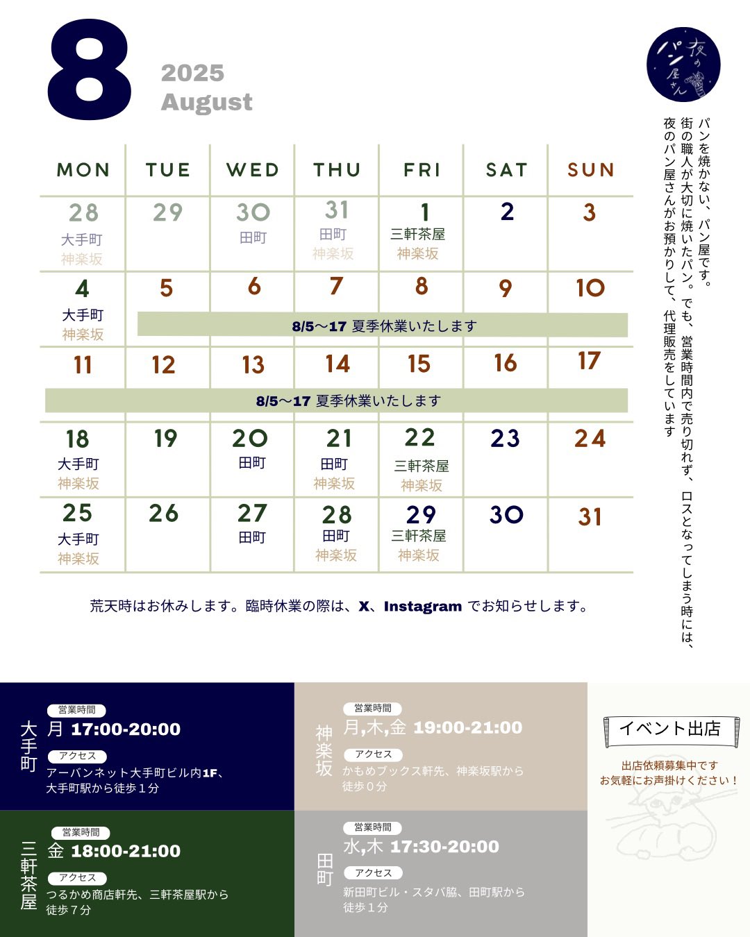 スケジュール 8月営業日のお知らせ 2025.08.19 昼夜問わず、非常に暑い日が続いておりますね。皆様、いかがおすごしでしょうか。 おかげさまで、どうにか夜パンは7月も乗り切ることができて、夏休みを挟んで、8月の営業をスタートいたしました。年内走り抜けていきたいと思います! 引き続きよろしくお願いいたします! 関連
