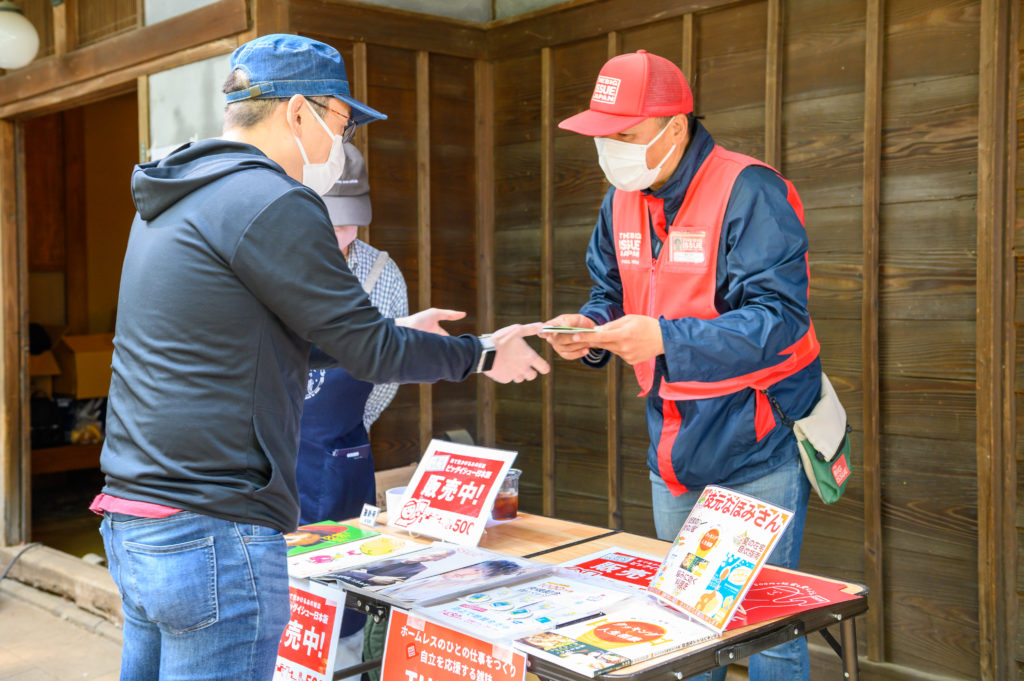 ホームレスの人の社会的自立を応援する雑誌「ビッグイシュー日本版」を、ビッグイシュー販売者が出張販売します。1冊500円のうち250円が販売者の収入になります。
