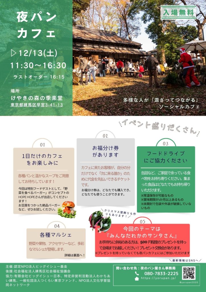 [主催]認定NPO法人ビッグイシュー基金  夜のパン屋さん [後援]社会福祉法人練馬区社会福祉協議会 [協力]有限会社ビッグイシュー日本 特定非営利活動法人わかちあい練馬 一般社団法人つくろい東京ファンド NPO法人文化学習協同ネットワーク